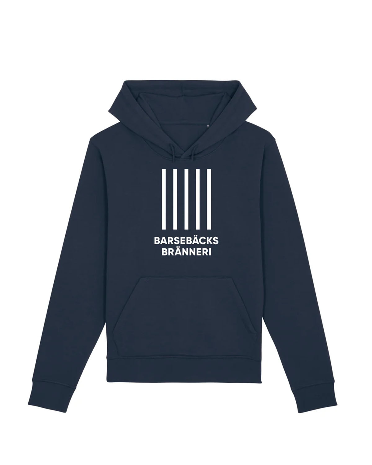 Hoodie i navy från Barsebäcks Bränneri. Tryck fram.