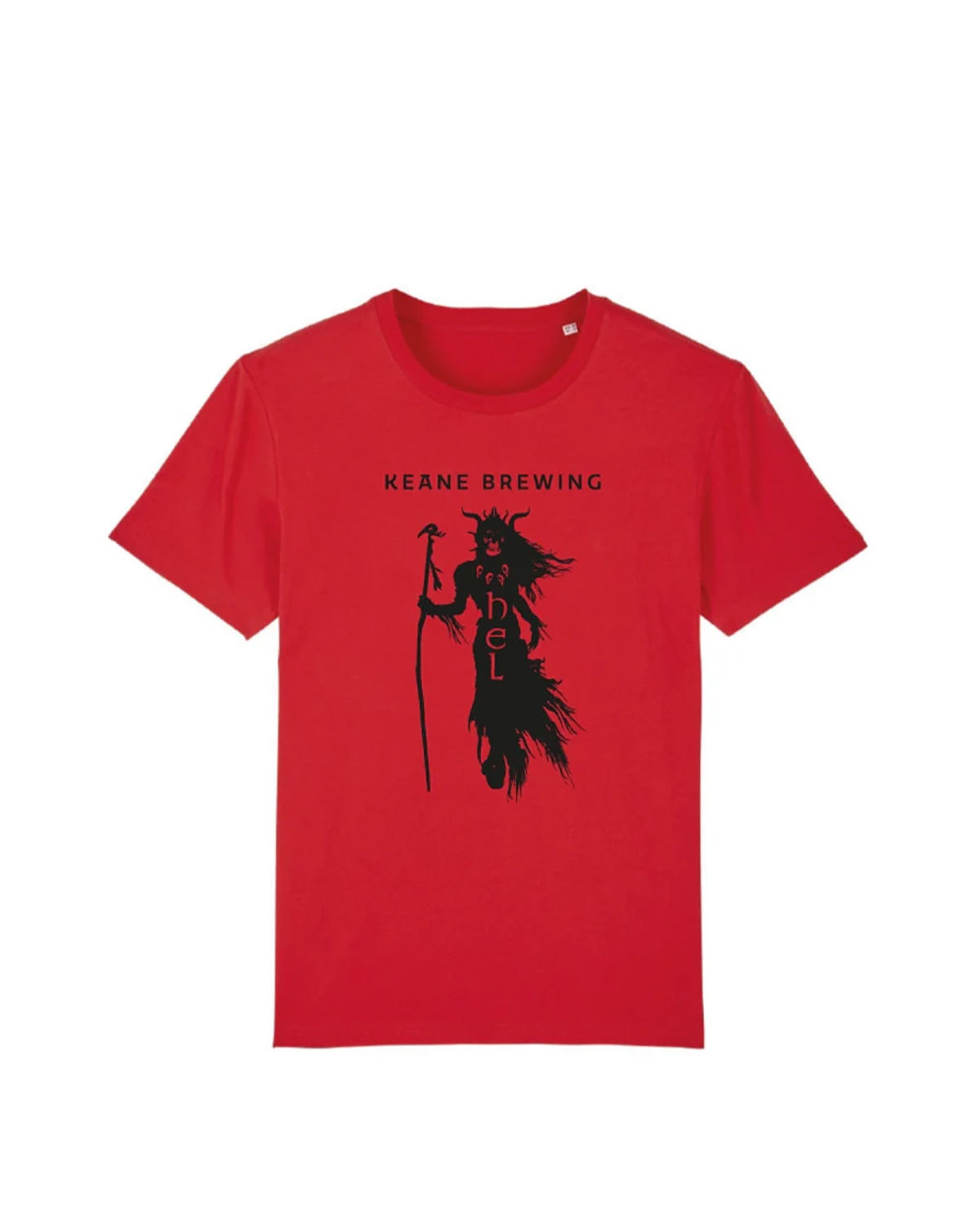 Röd kvalitets t-shirt från Keane Brewing med Hel tryckt stort på bröstet.