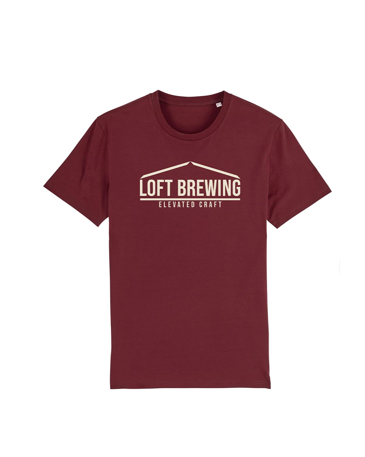 T-Shirt från Loft Brewing i burgundy, tryckt med stor logo på bröstet i off-white.
