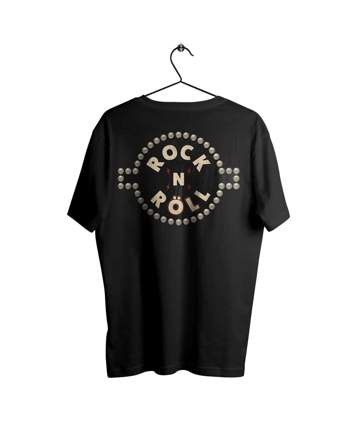 Snygg svart tee tryckt med Lager tryckt på vänster bröst och Rock N Röll tryckt på ryggen.